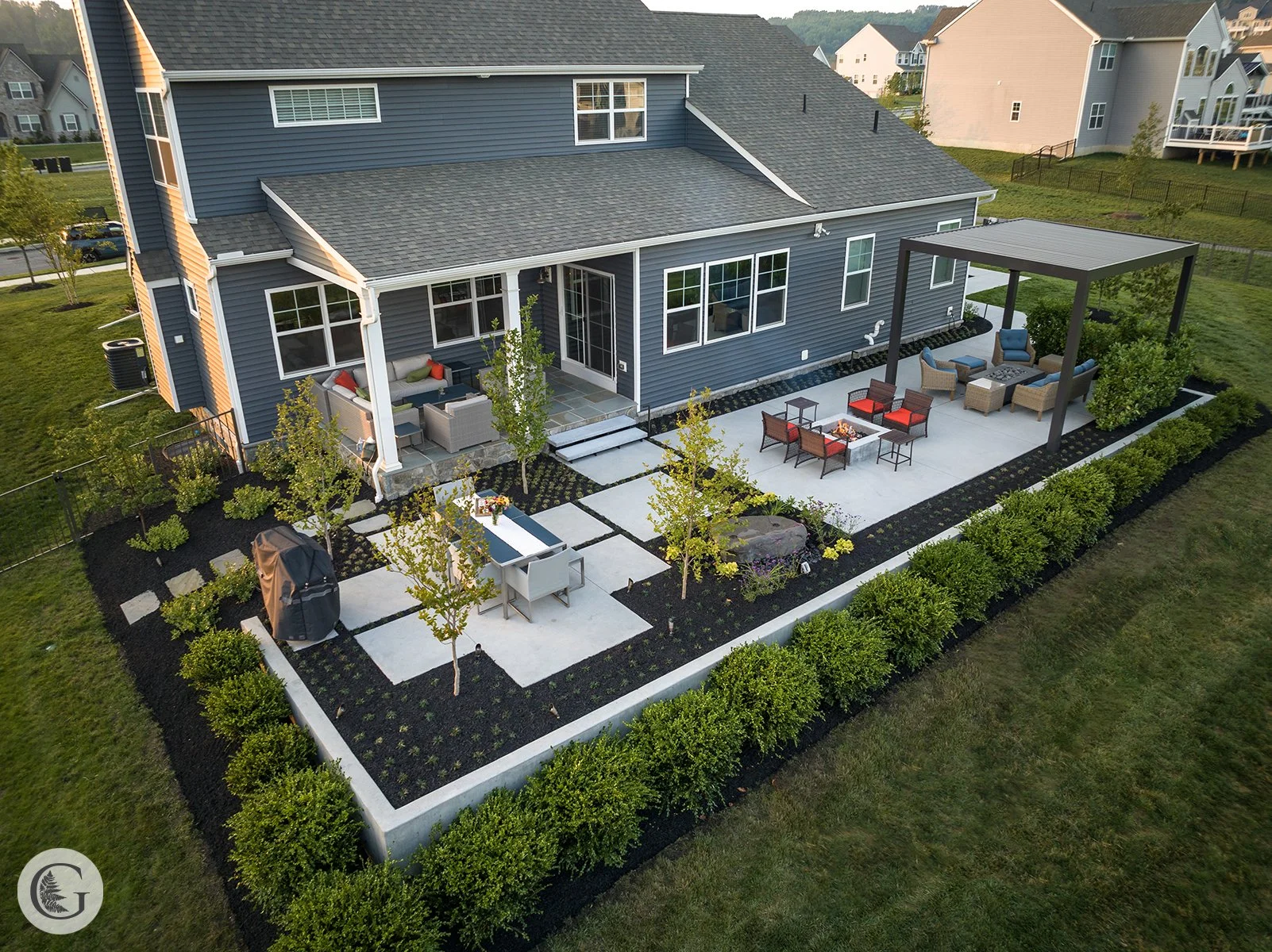 Details in this project came down to lines. These lines were carefully selected for a sleek modern look and everything was planned. The space was planned for the essentials: furniture, the grill, trees, plants, the pergola, and the water feature. When you look at the project as a whole, you will observe modern lines in a beautiful random in appearance pattern. But when you look closer, you will see every negative space has a planned purpose!
