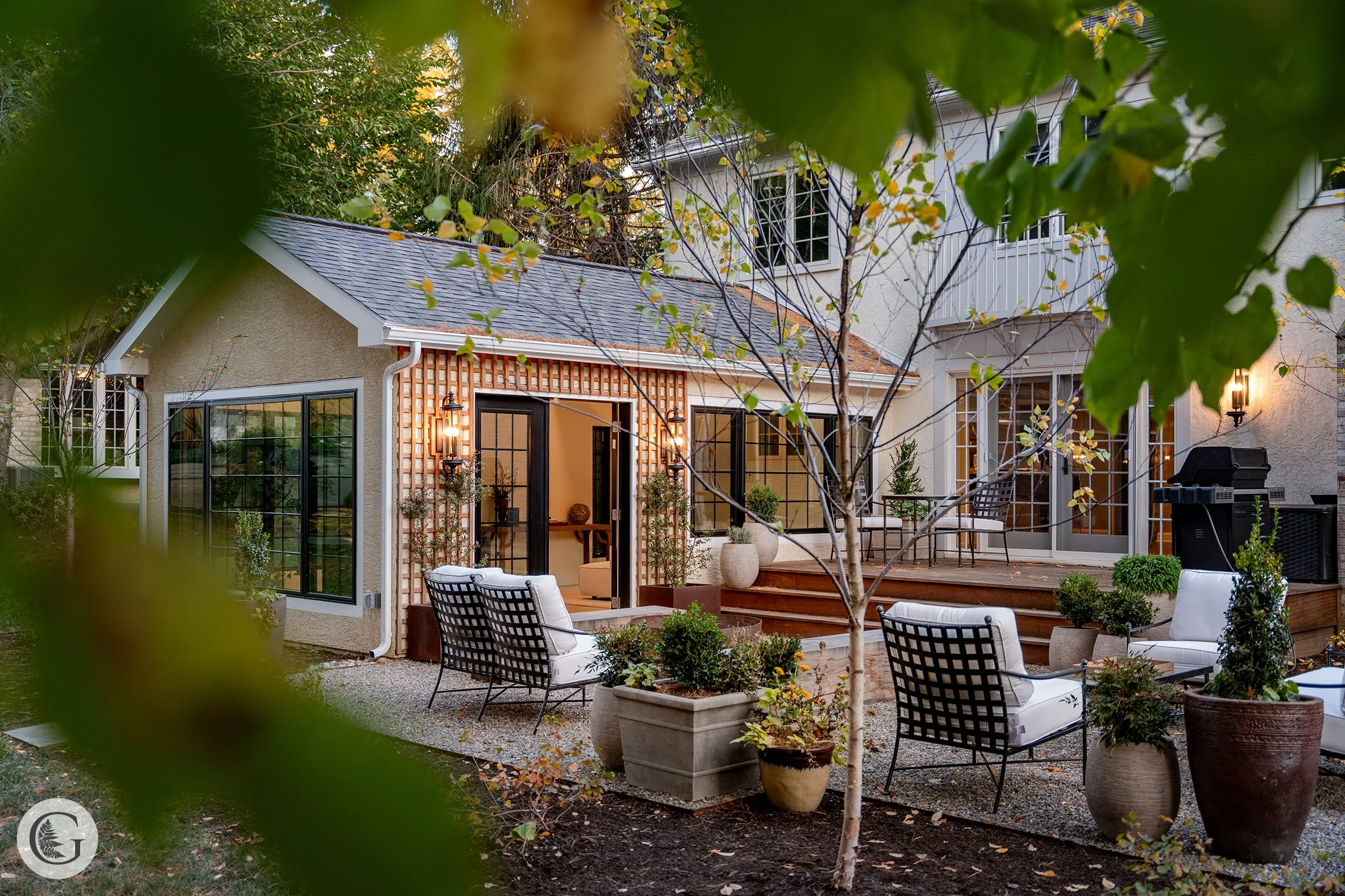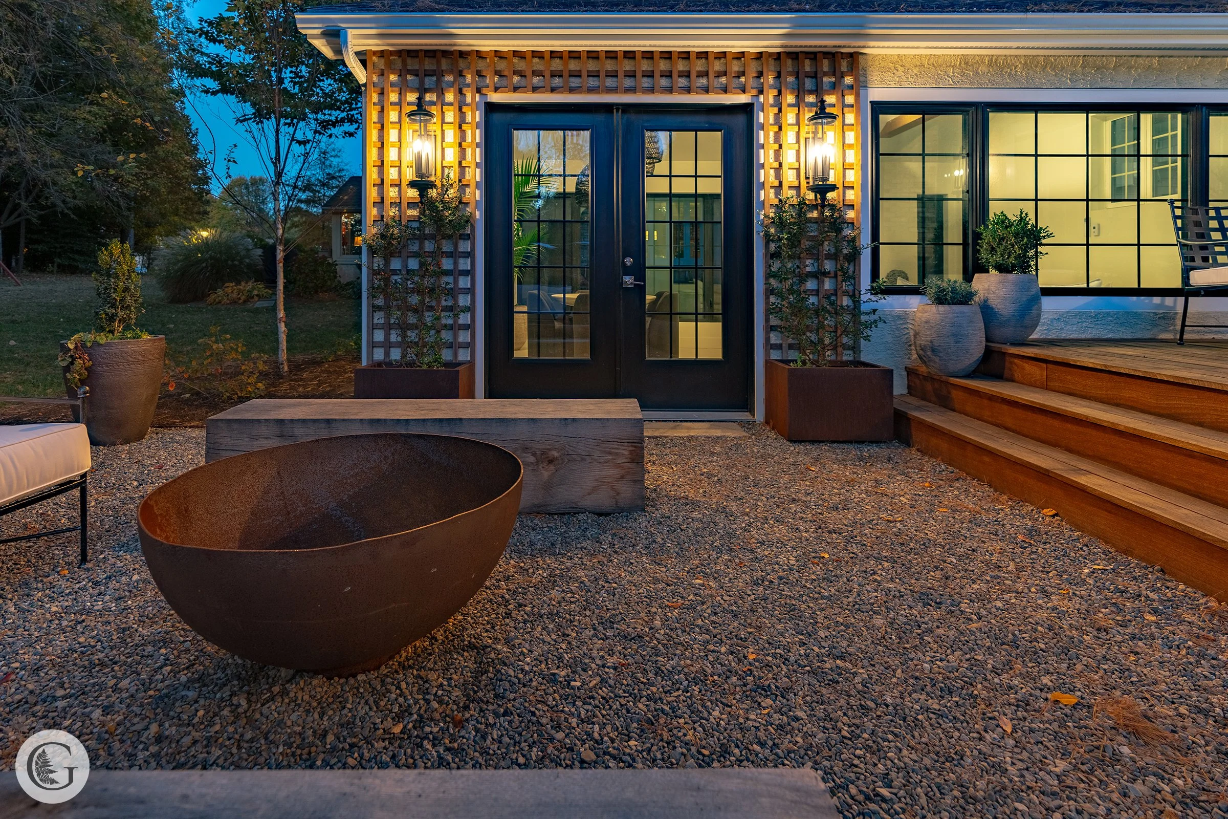 Moving outdoors, the design transitions effortlessly into a gravel courtyard anchored by a corten steel fire bowl and custom manufactured wooden beam benches. The plantings are simple and architectural, balancing the boldness of the hard materials with softness and life. This space is built to be used year-round, from cozy fall fireside evenings to breezy spring mornings with coffee in hand. Raised wood steps lead to an adjoining dining area, completing the experience of indoor-outdoor harmony.