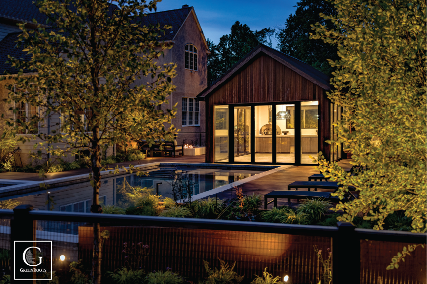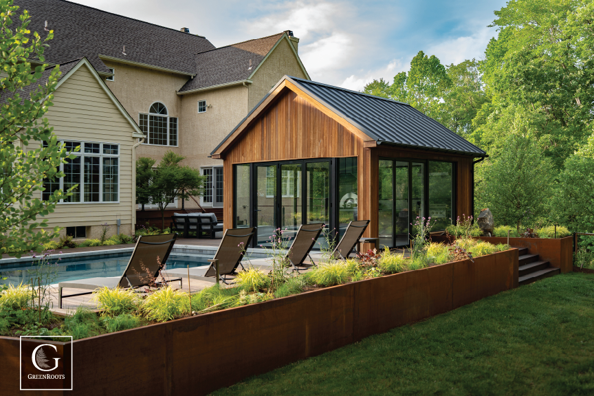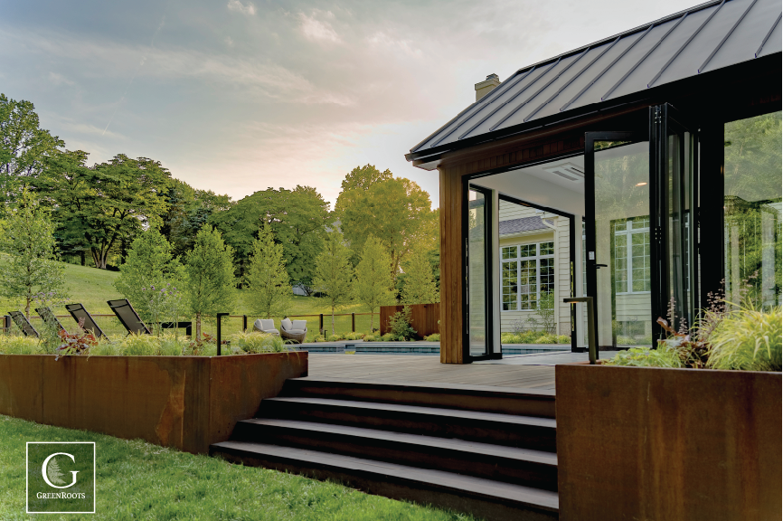 This Chadds Ford, PA home creates space for living for all 4 seasons. Seamless flow from inside to outside making poolside memories a breeze. This custom pool house and kitchen will offer respite from the weather in all seasons and be a space to grill and bake pizzas. The fully accordion doors allow the entire pool house to open up for a full outdoor experience as well. The custom cortes steel retaining wall keeps the entire space on one level while creating a beautiful modern transition to the rest of the backyard.