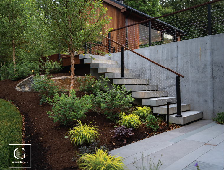 These concrete steps which allow for basement entry and exit give the illusion of floating in mid air. This illusion makes even thick concrete look light and airy while painting a modern aesthetic fitting with the clean design of the entire outdoor area.